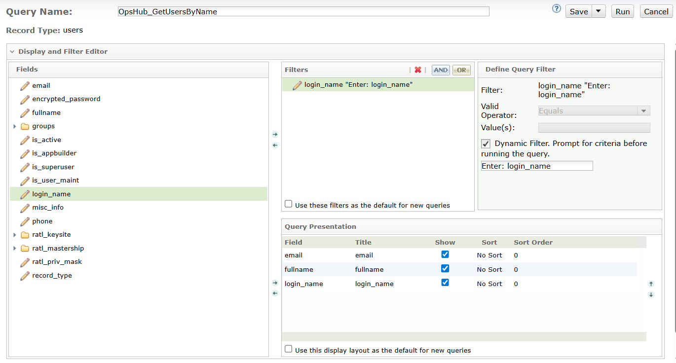 * Create a query, `OpsHub_emptyQuery`. Do not select any field or filters for this query.