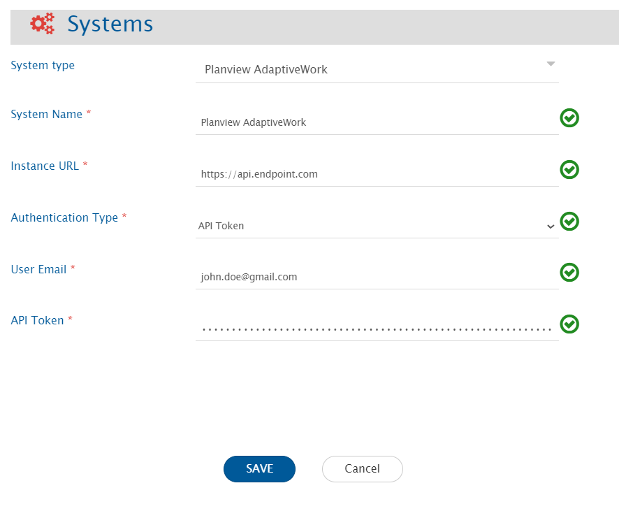 | **API Token**           | Provide the API Token generated in Planview AdaptiveWork for the user given in "User Email" field. This field is required when Authentication Type is selected as "API Token". Refer to [this section](https://success.planview.com/Planview_AdaptiveWork/API/API_Keys_Support) for generating the API token. |