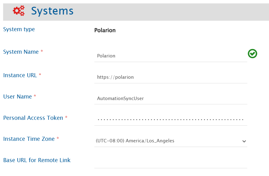 | **Base URL for Remote Link** | Always                    | <p>Provide a different instance URL of the Polarion instance. This URL will be used for generating the Remote Link.<br>Note: If "Base URL for Remote Link" is empty, it will use default <strong>Instance URL</strong> to generate remote link if configured on integration.</p> |