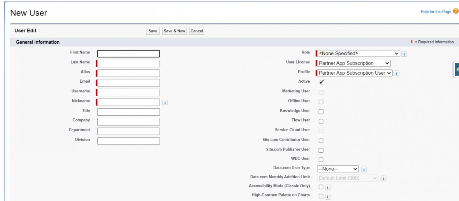 * Create a dedicated <code class="expression">space.vars.SITENAME</code> user in Salesforce. This user shouldn't perform any other action from Salesforce's UI. For more details on creating a new user, refer to the [New User](#new-user) section.
