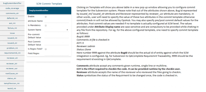 Clicking the Template will bring up the table shown above in a new pop-up window. It will allow you to configure commit template for the Subversion system. Please note that out of all the attributes shown above, Bug Id represented by issueid\_int/ issueid\_str attribute and Reviewer represented by reviewer\_usr attribute are mandatory. In other words, user will need to specify the value of these two attributes in the commit template otherwise commit/check-in will not be allowed. You may also specify pre/post commit default values for the attributes. Post commit values are needed when no template is configured at the SCM level. The values provided under Attribute Display name are case sensitive and are compulsory to be provided while checking-in any file from the repository. For example, for the above configured template, you need to specify the commit template as follows: