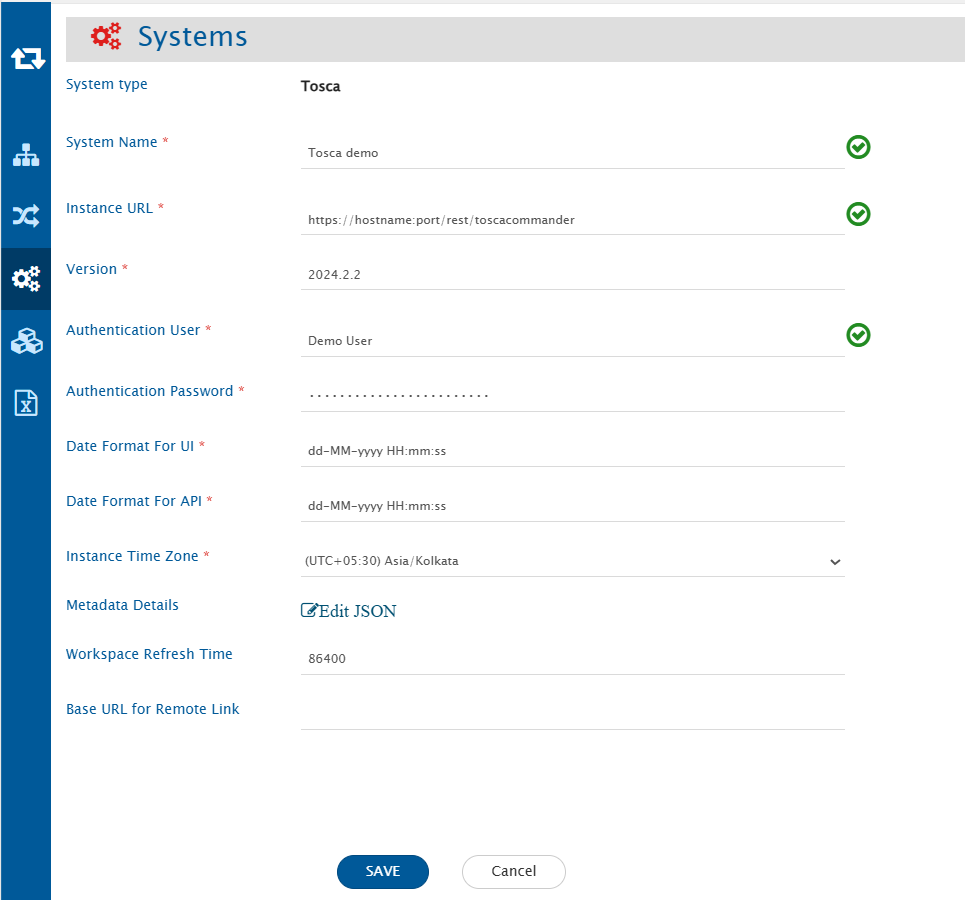 | **Instance URL**           | Provide URL for Tosca instance. Example: /rest/toscacommander                                                                                                                                                                                                                                      |