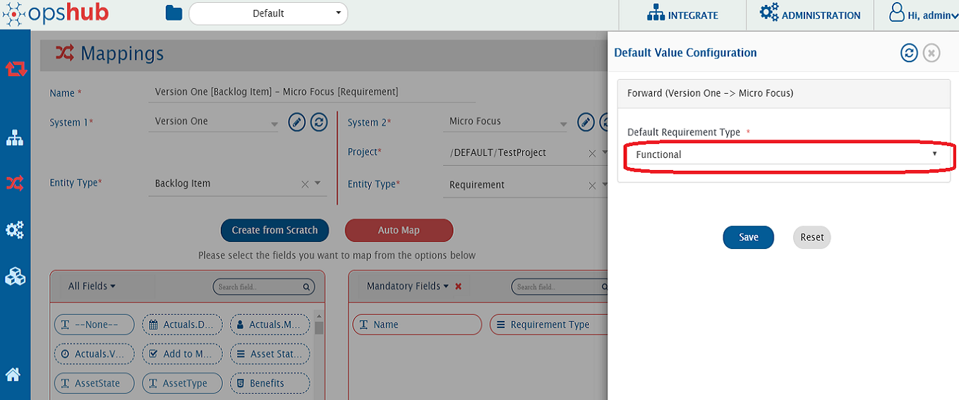 * Create mapping for 'Story' to 'Requirement' with the default value for 'Requirement-Type' as 'Functional'. For 'Requirement-Type' field, default value is required, so map 'Requirement-Type' with None and set default value as 'Folder'.