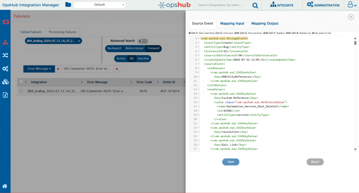* Instead of event failures of a single entity, if you want to see the failures of every integration, you can delete the currently selected integration name on the top left and hit the search button. Doing so will show all the event processing failures through out the OIM.