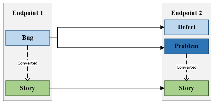 * Here, the Defect entity SE1 of Endpoint 1 will be synchronized in Endpoint 2 as Bug in Project B (TE1) and as a Problem entity in Project C (TE2).