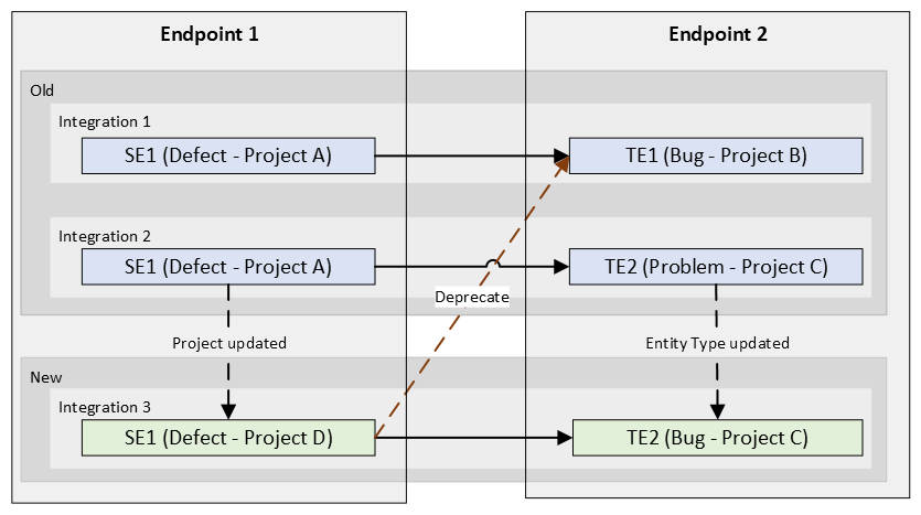 * In this case, the deprecation and creation of the entity will take place at "Endpoint 2". There will be a standard create/update sync from "Endpoint 2" to "Endpoint 3".