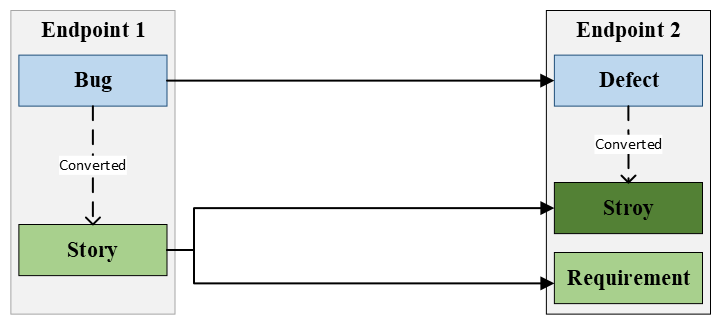 - In this example, "Bug" → "Story", first fetched by "Story - Story" integration. So "Defect" → "Story" and a new "Requirement" is created by "Story - Requirement" integration.