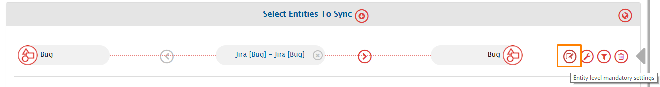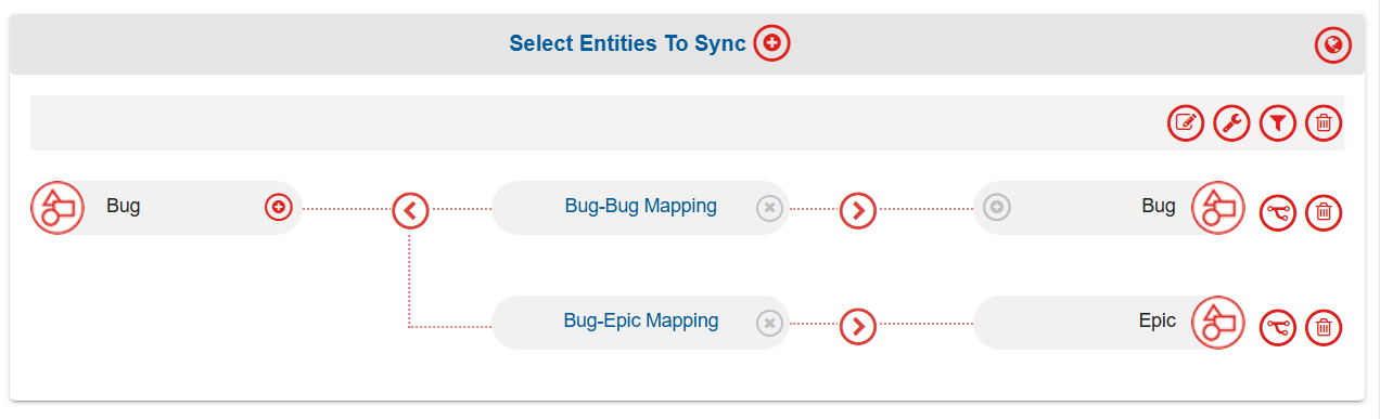 * In the **Select Entities to Sync** section, select the entities (issue types) you want to synchronize between the systems. A list of entities that are common for both projects would appear for both systems. Click the ones you want to synchronize. You can synchronize multiple entities in one integration. To add more entities, click the plus sign \[+] adjacent to **Select Entities to Sync**.
