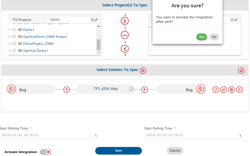 * In the **Select Project to Sync** section, select the projects you want to synchronize between the systems by clicking them. For example, in this case, we select Demo Project from TFS and OpsHub project from JIRA.