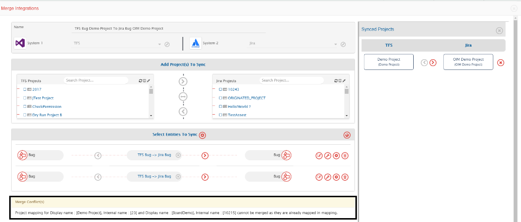 The Merge Integration preview has merge integration preview along with Merge Conflict(s). Merge Conflict(s) has warnings because as per the Primary Integration, TFS Demo Project Bugs are to be synchronized to Jira OIM Demo Project and as per the Secondary Integration TFS Demo Project Bugs are to be synchronized to Jira BoardDemo Project. In this case, the primary configuration is being considered.