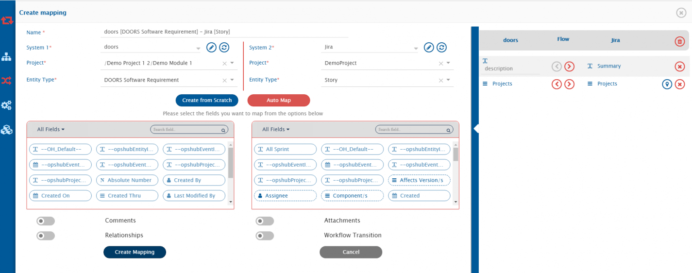 * From the Value Mapping pop-up that opens after clicking ![](https://3739347370-files.gitbook.io/~/files/v0/b/gitbook-x-prod.appspot.com/o/spaces%2F1a8GpUm2lq3lKbytaYjt%2Fuploads%2Fgit-blob-e738613e7434e09ede58bd9212168a30936bfe5c%2FI_9.png?alt=media), select the corresponding values from both systems by clicking them. We select Demo Module 1 from IBM DOORS and DemoProject from Jira.