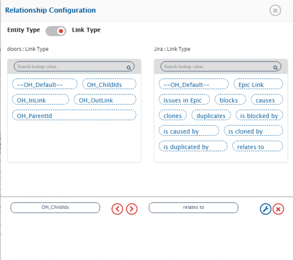 * Click **Next** in the Relationship Configuration pop-up to map link type. We link `Oh_Childids` with `relates to`, which means SR from IBM DOORS, which is a child to the Requirement, relates to Story in Jira in the same manner.
