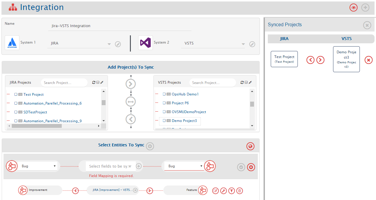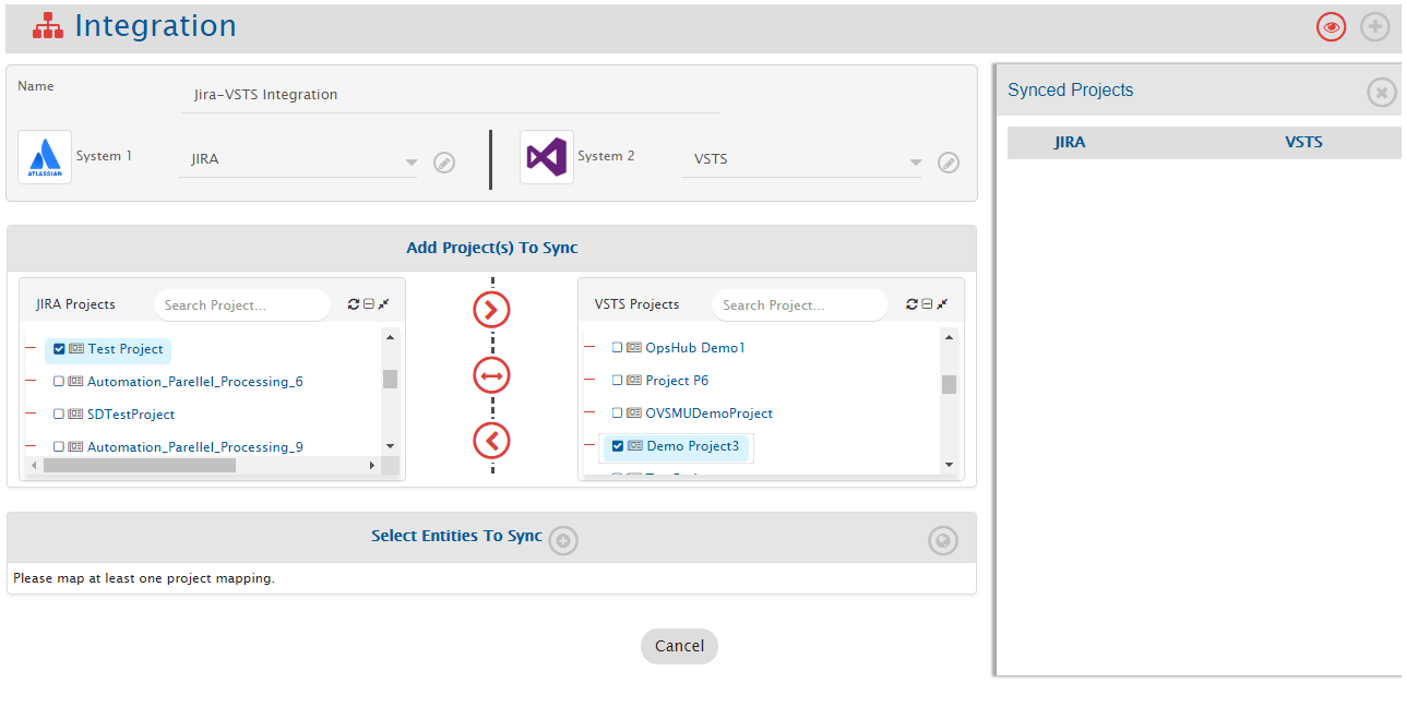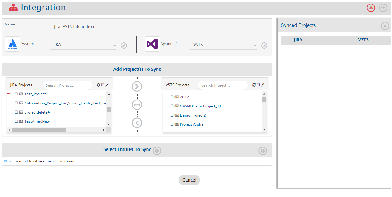 * From the **Select Entities to Sync**, select the relevant entities for both systems. In this case, we will select **Bug** from Jira and **Bug** from Azure DevOps Services (VSTS). Create a Mapping for these entities as well.