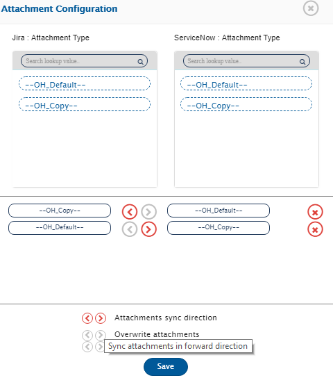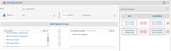 * Click the forward arrow (>) if you want to integrate any project only from Jira to ServiceNow, bi-directional arrow (<-->) if that project needs to be synced bi-directionally, or backward arrow (<) if for that projects synchronization is needed only from ServiceNow to Jira.