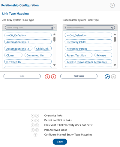 * From entity types drop-down list, select **Test Result** in Jira Xray and **Test Run** in Codebeamer.