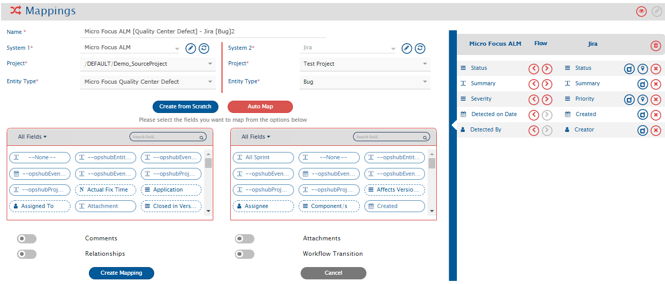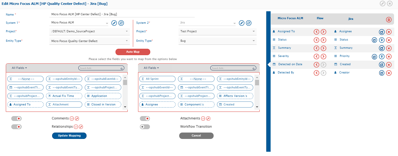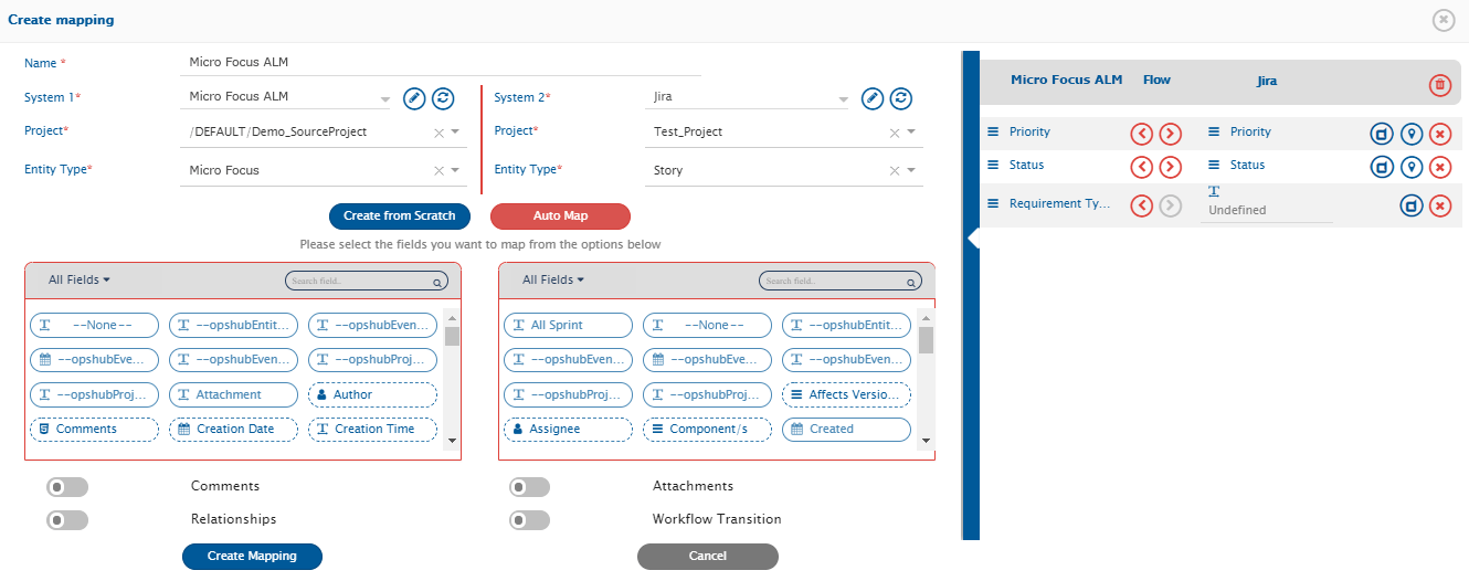 * Choose Mandatory field(s) for Micro Focus ALM first and map them to the equivalent field in Jira and then repeat the same steps for Jira.