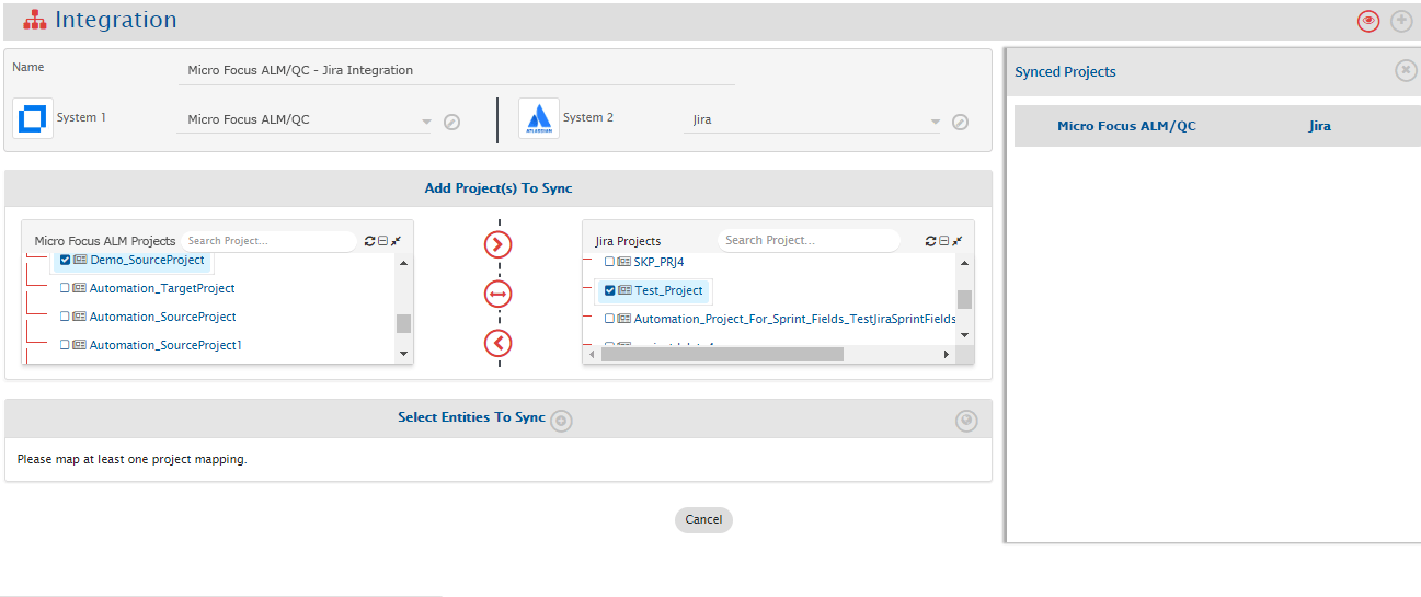 * From the **Select Entities to Sync**, select the relevant entities for both systems. In this case, we will select **Defect** from Micro Focus ALM and **Bug** from Jira. Create a Mapping for these entities as well.