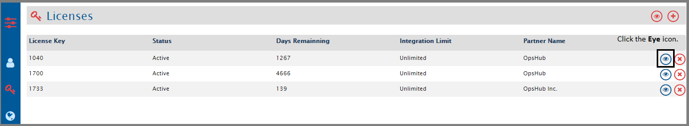 * Click the eye icon against the License name for which you want to view the details.