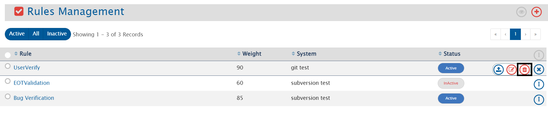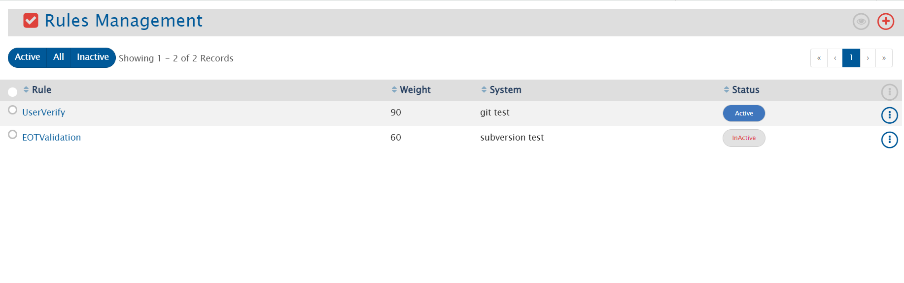 * **Activate/Inactivate rules**: Select the *Status* button against the rule for which you want to toggle the status. The status will change from *Active* to *Inactive* or from *Inactive* to *Active*
