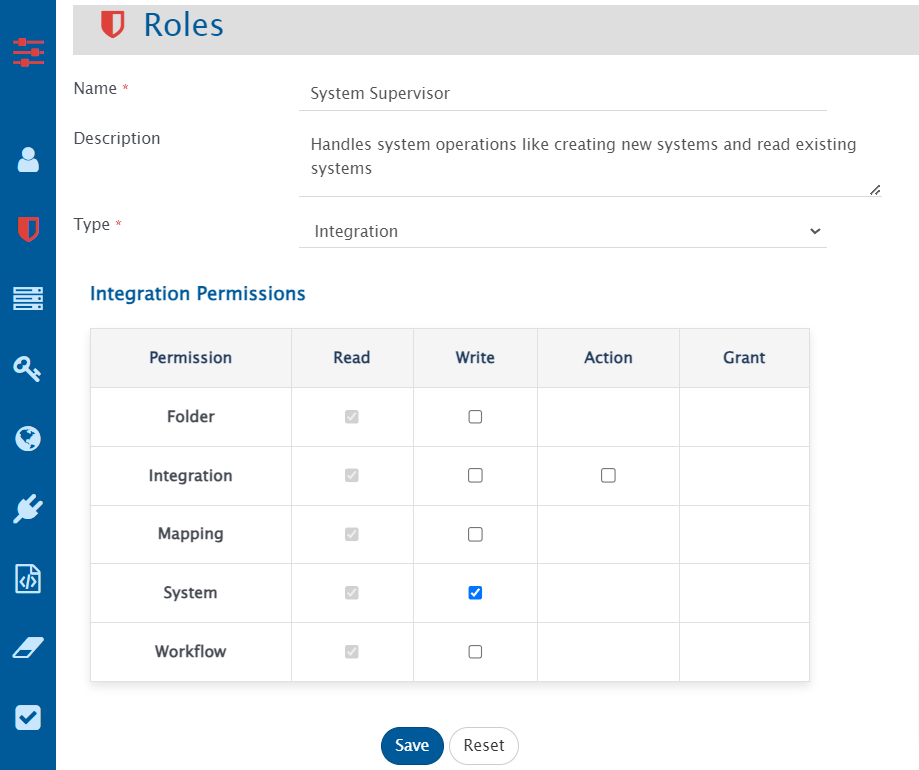 * In Integration type role, **read** permission is granted by default on all resources like System, Mapping, Folder, etc.