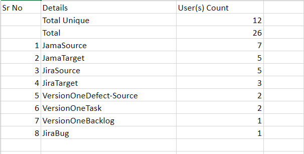 1. **UserCountSummary.csv**: It contains count of unique users across all systems configured, total users count across all systems configured and total users count per system. For more information, refer to [UserCountSummary](#usercountsummarycsv) section.