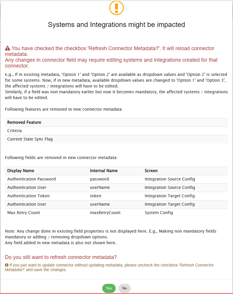 This warning box contains instructions on how the systems and integrations created on the connector will be affected if you choose to refresh the metadata. As shown in the image, this warning also shows the particular field that is removed and the screens affected by it.