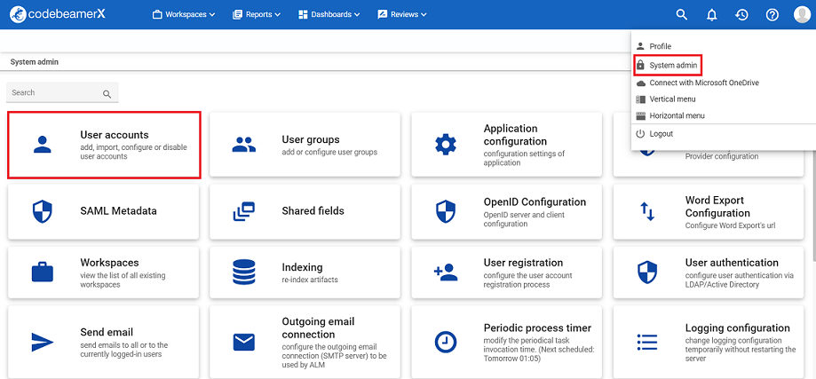 Click the three dots (codebeamer) / dropdown (codebeamer X) provided beside Admin tab.