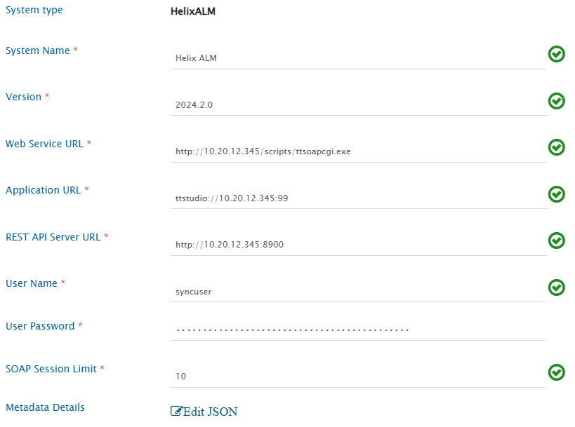 Provide the Helix ALM Server Web Service URL. This URL is used for connecting to Helix ALM SOAP API. Format for URL: http://:/scripts/ttsoapcgi.exe.