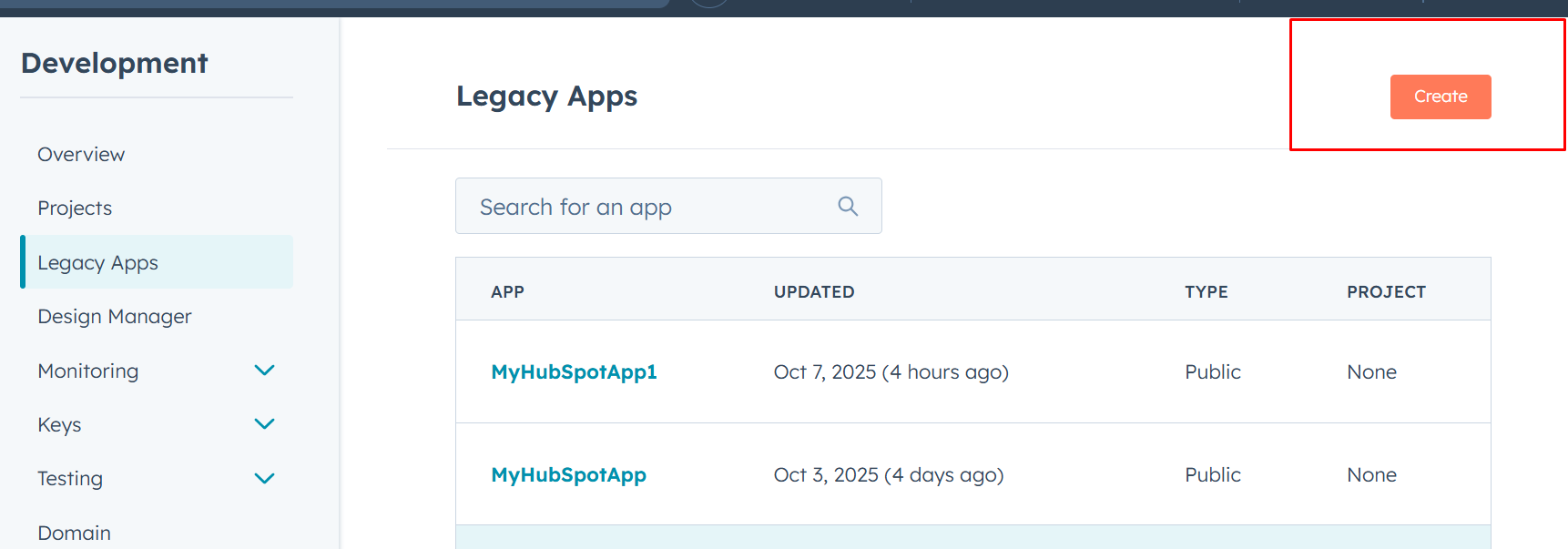An app (legacy public app only) associated with your developer account. Refer to Create Public App in HubSpot to know how to create public app in HubSpot.
