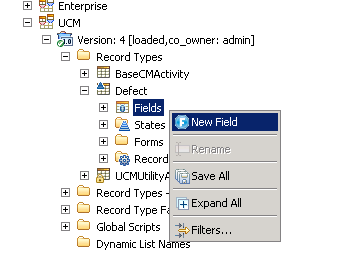 * Right click on **Fields**, under record type **Defect** or any other record type in which new field needs to be added.
