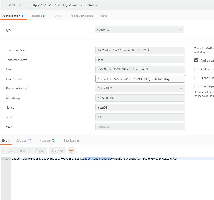 * Click *Send*. In the response, OAuth token and OAuth token secret will be generated.