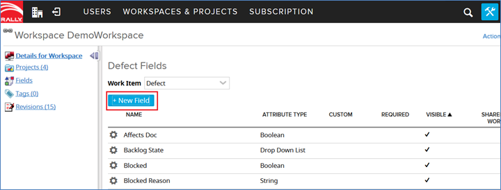 * Click the **Workspace** from the **Workspaces & Projects** list in which you want to create custom fields.