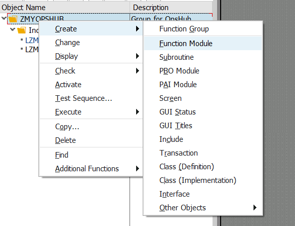 Right-click 'ZMYOPSHUB' and select 'Function Module'.