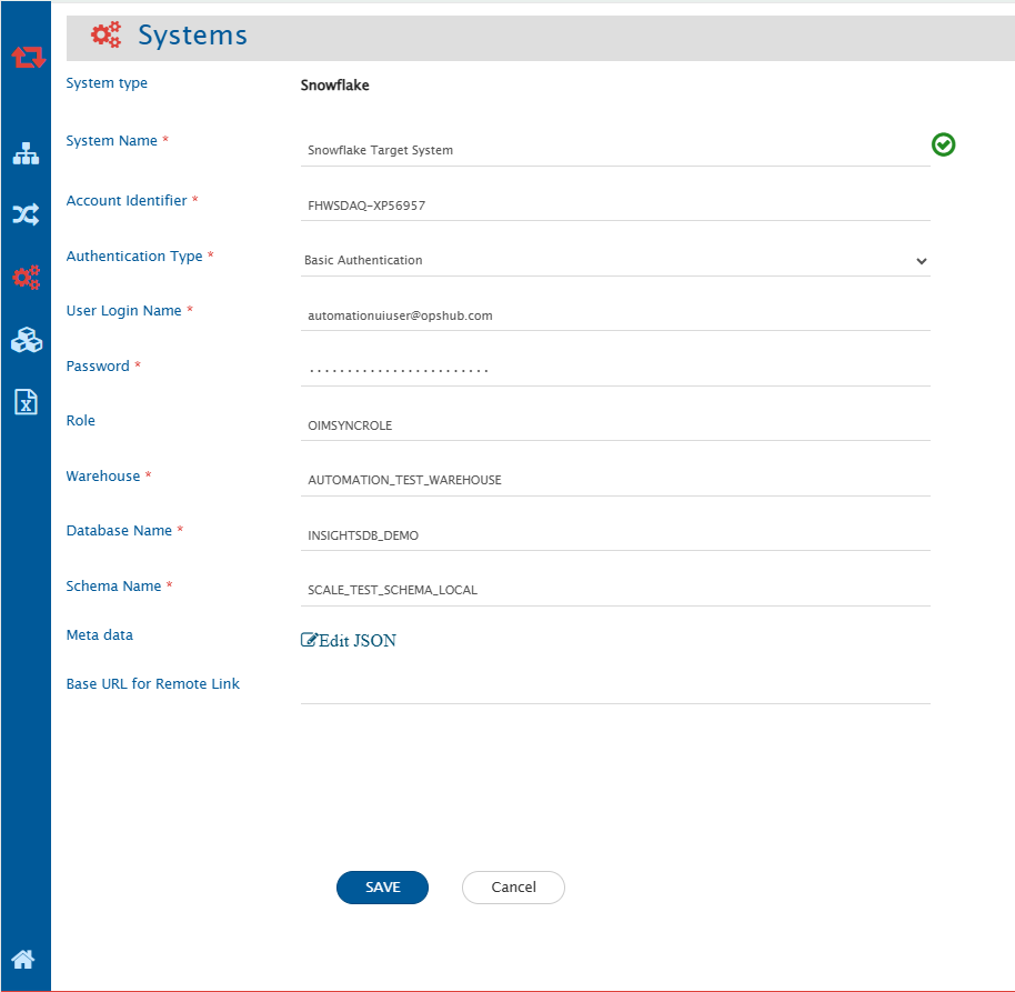 Ensure that you enter valid user credentials in the Snowflake system form in OpsHub Integration Manager. If incorrect credentials are used, Snowflake may temporarily lock the OpsHub dedicated user account. When this happens, OpsHub Integration Manager will be unable to perform any operations using that user. If the user gets locked, you can either wait until Snowflake automatically unlocks the account or ask the account admin to remove the lock immediately by running the following command: