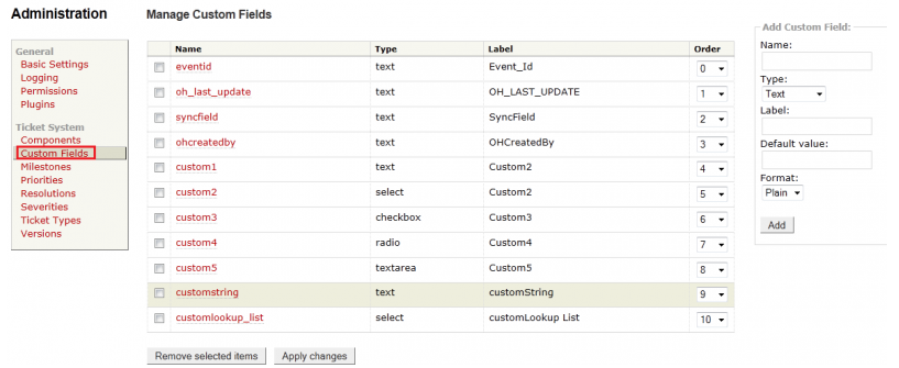 In Trac, following custom fields are required. For creating custom fields, please refer appendix [Custom Field Configuration](#custom-field-configuration).