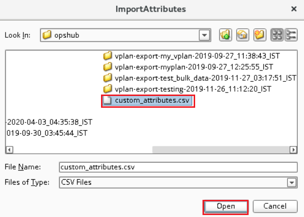 * It will open **ImportAttributes** window. Please select the file that is saved in step 1 ([Create csv file for Custom Field](#create-csv-file-for-custom-field)) and click **Open** button. For example, if file is saved with the name `custom_attributes.csv`, then select that file in this window and click Open button