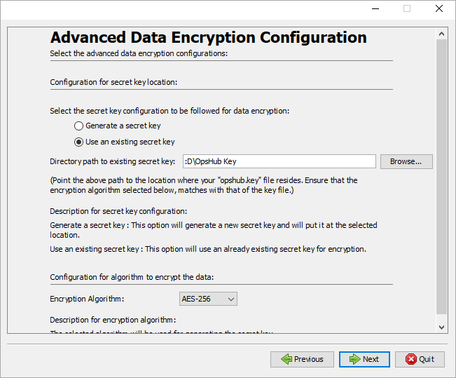 * Advanced Data Encryption: Enables user to generate a secret key and store it in a secured location, or select an existing secret key if available. This configuration also allows the user to select the desired encryption algorithm for ensuring security of the application.