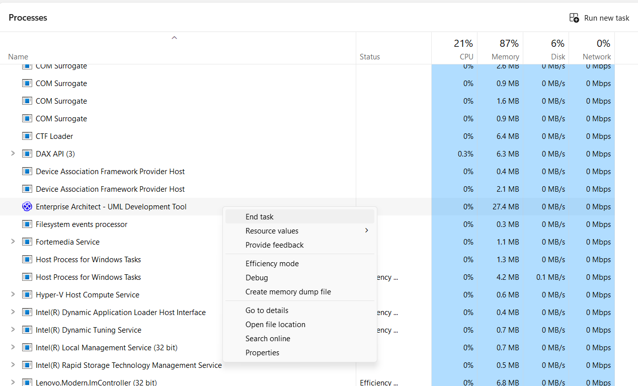* In the 'Background processes' section locate 'Enterprise Architect - UML Development Tool' processes.