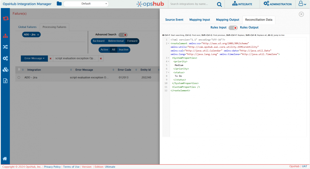View Failed Event: Allows users to view detailed information regarding event fetched from the source system, mapping input and output for the configured mapping, and rules input and output for configured reconciliation rules.