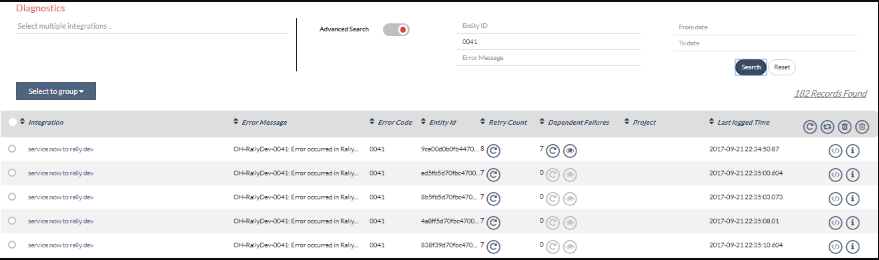 Note: Instead of event failure(s) for a single entity, if you want to see the failures for all integrations configured on your OpsHub Integration Manager instance, delete the currently selected integration and hit the search button. You can also add multiple integrations by clicking on the text box below the currently selected integration(s) and add other integration name(s).
