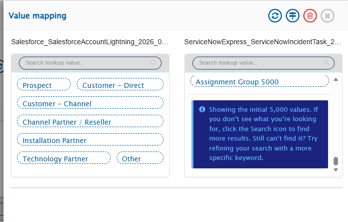 Lookup Type fields can contain a large number of values. To ensure faster performance and a smooth user experience, **OpsHub Integration Manager** efficiently displays up to the first 5,000 values and allows you to quickly search for additional values when needed.