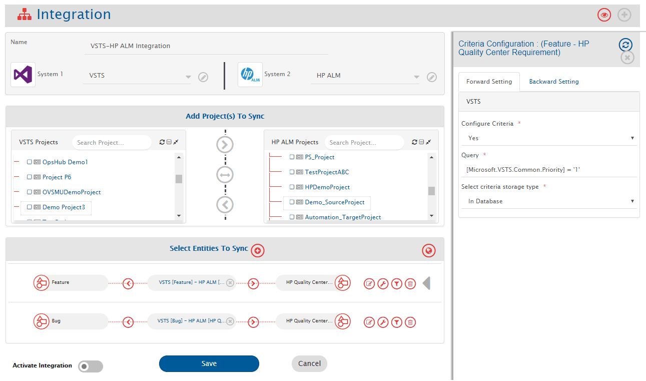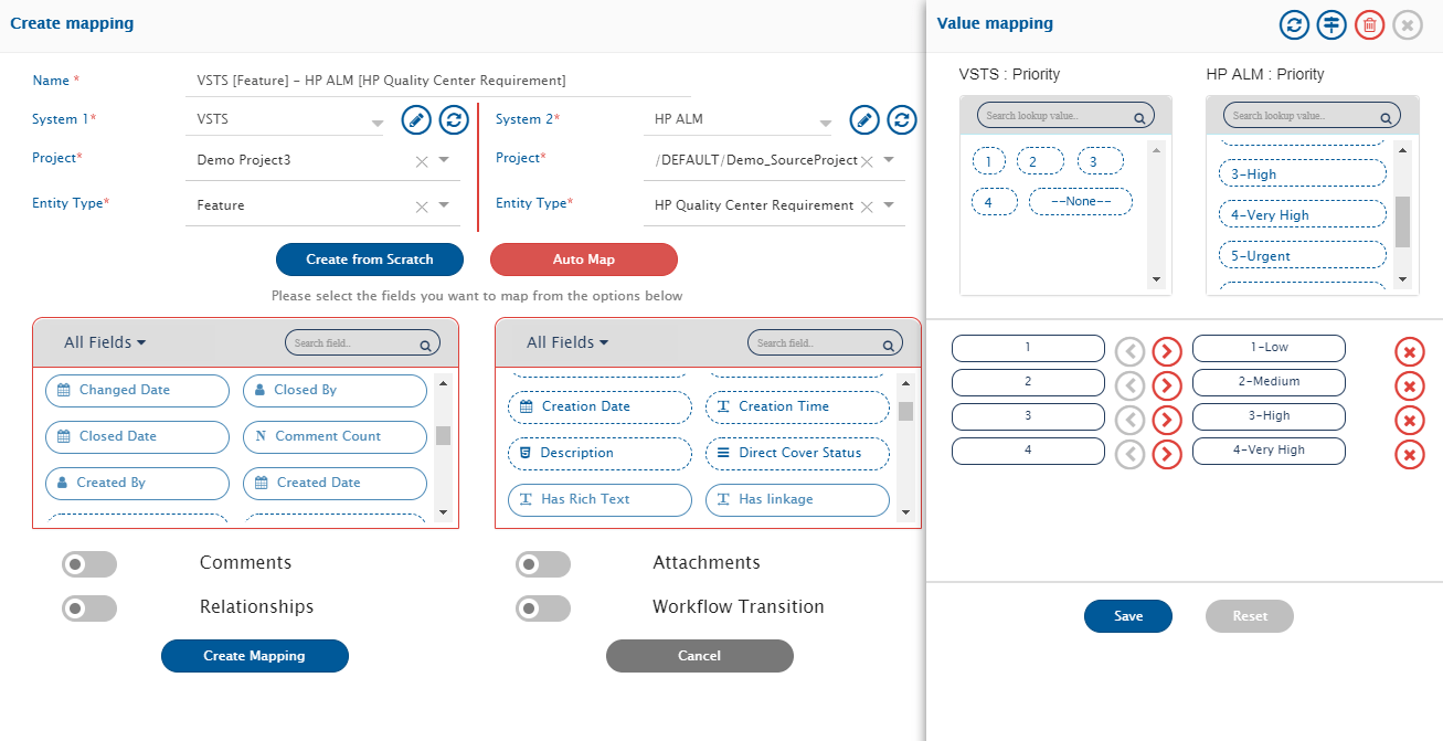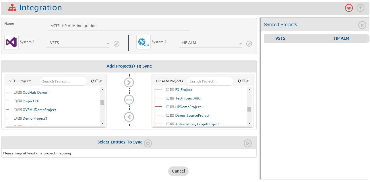 Example: **Demo Project3** from Azure DevOps Services (VSTS) and **Demo\_SourceProject** from Micro Focus ALM.