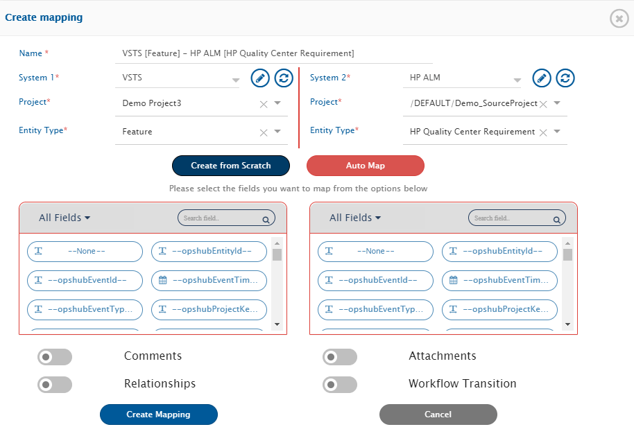 At this stage, you can also map entities such as comments and attachments. Refer to the videos on this page to learn in detail about [Comments](https://docs.opshub.com/v7.217/integrate/configure-integrations/mapping-configuration#comments) and [Attachments](https://docs.opshub.com/v7.217/integrate/configure-integrations/mapping-configuration#attachments) mapping.
