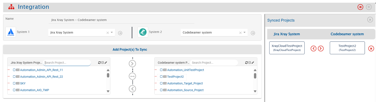In the Add Project(s) to Sync section, select the projects you want to synchronize between Jira Xray and Codebeamer by clicking them. For example, we have selected XrayCloudTestProject project in Jira Xray and TestProject2 project in Codebeamer.