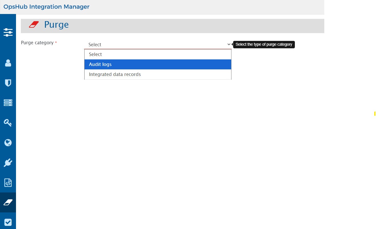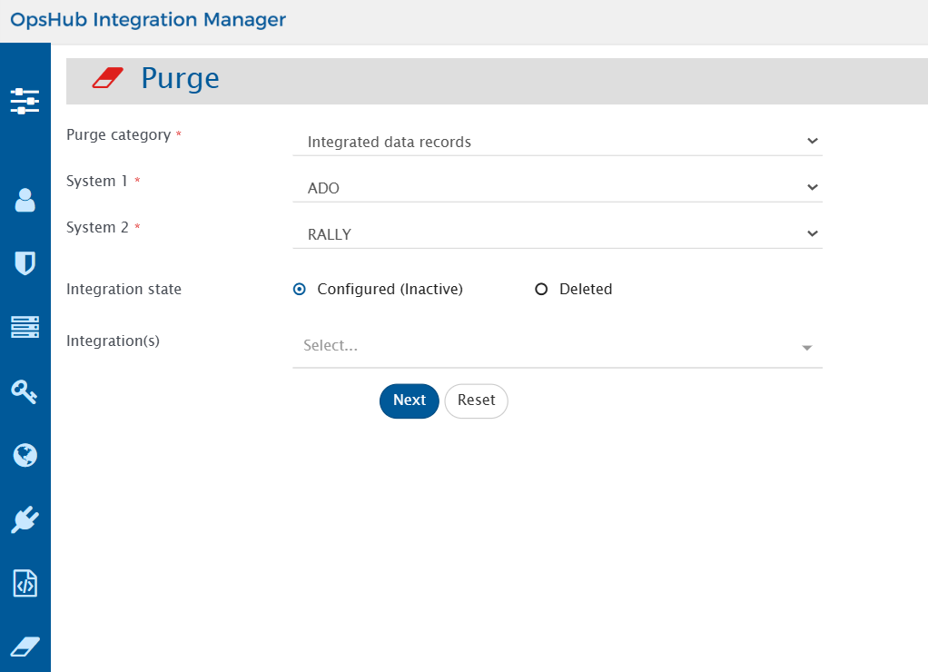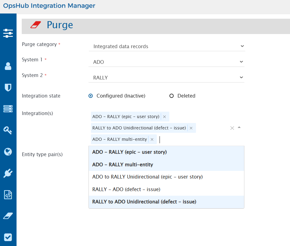 Integrated Data Records: It enables users to purge integrated data records from the OpsHub Integration Manager database. Refer to the Purge Integrated Data Records section for more details.