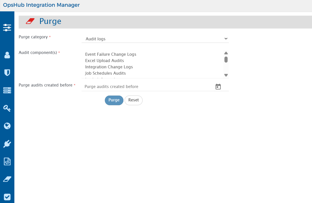 Audit Logs: It enables users to purge different types of change logs, such as Excel upload audits, Job schedule audits, Roles audits, etc. Refer to the Purge Audit Logs section for more details.