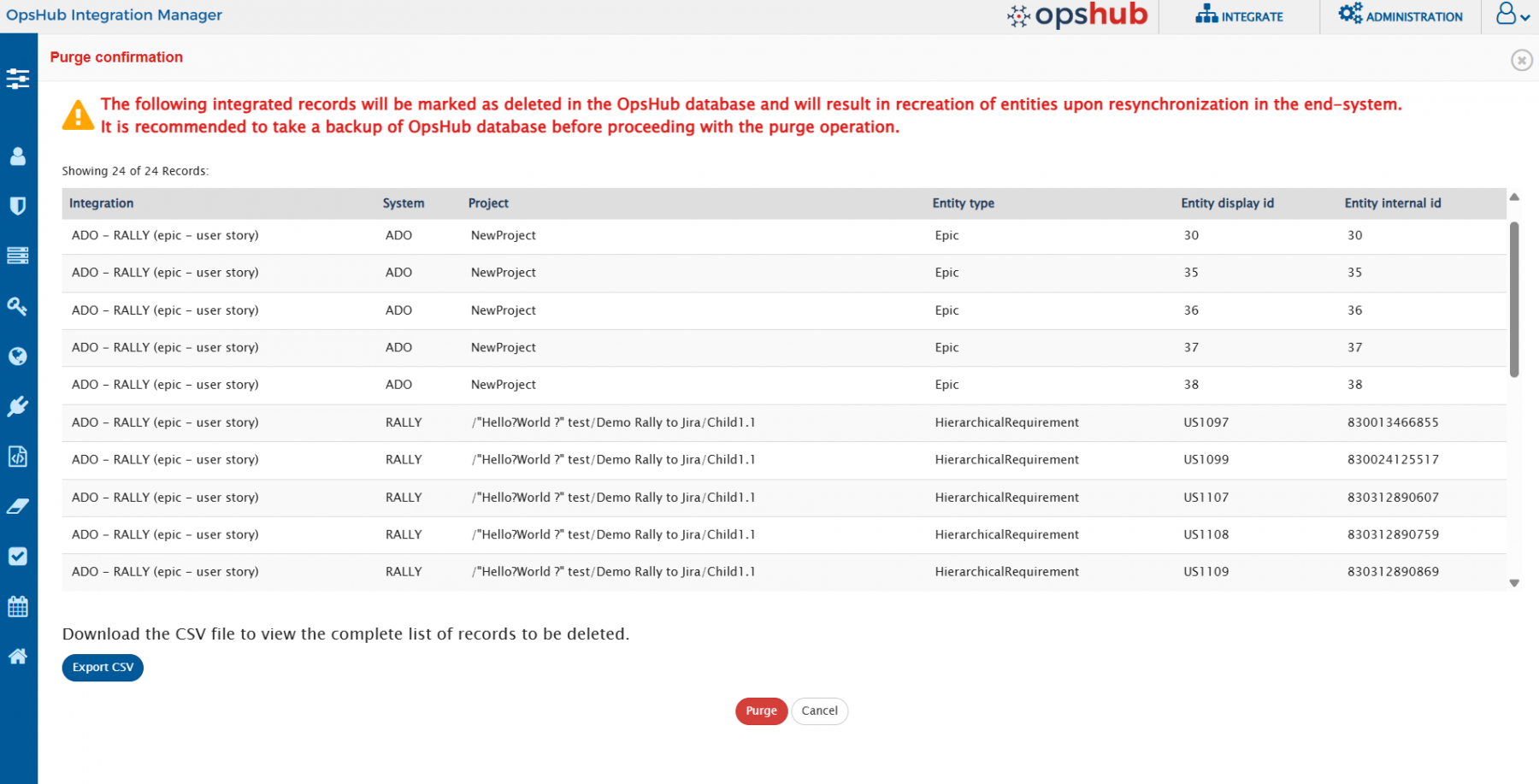 The Purge confirmation page is a critical safety checkpoint in the database cleanup process that displays a comprehensive preview of all integrated records that will be marked for deletion from the OpsHub database. This page serves as the final verification step before executing the purge operation.