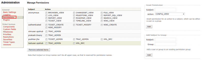 * In **Action** of **Grant Permission** options, select the permission you want to give to the selected Subject. For Example, 'XML\_RPC'.