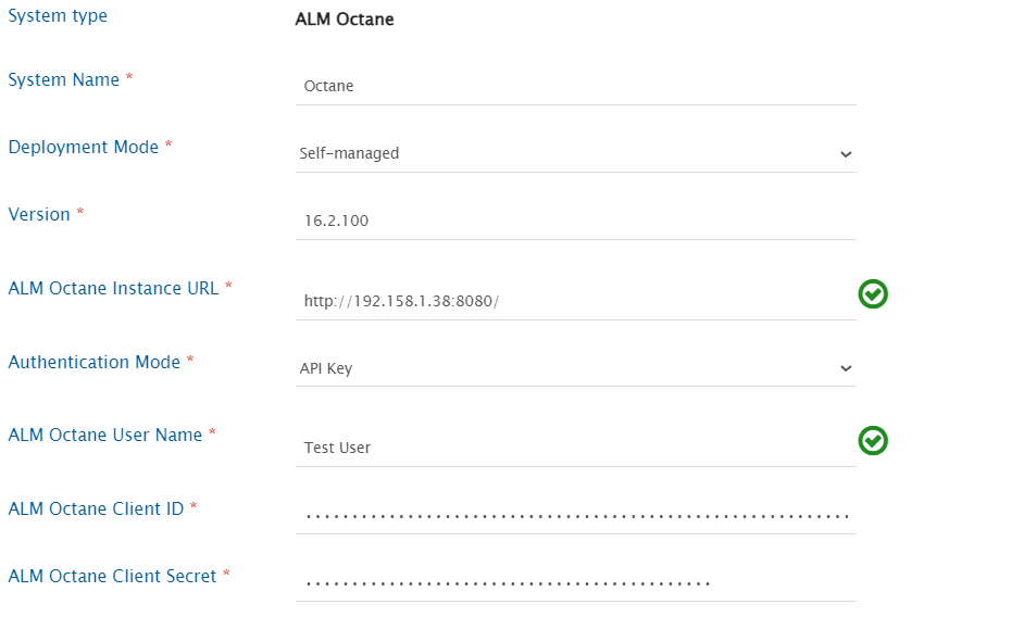| **ALM Octane Client ID**     | Only when 'API Key' authentication is selected.                                       | Provide the Client ID.                                                                                                                                                                                                                                                                                                                                                                                                                                                                                                                                                                                                                                                                                                         |