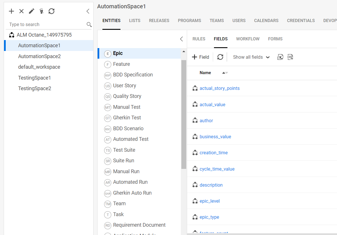Follow the steps given below for creating custom fields in any entity in a specific workspace in ALM Octane.